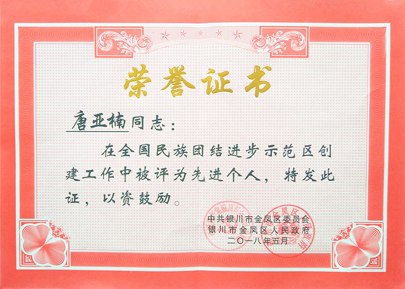 唐亞楠被評為全國民族團結(jié)進步示范區(qū)創(chuàng)建工作先進個人