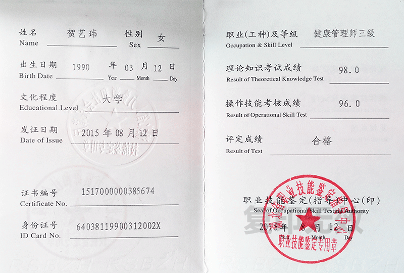 4賀藝瑋獲得高級(jí)健康管理師資格