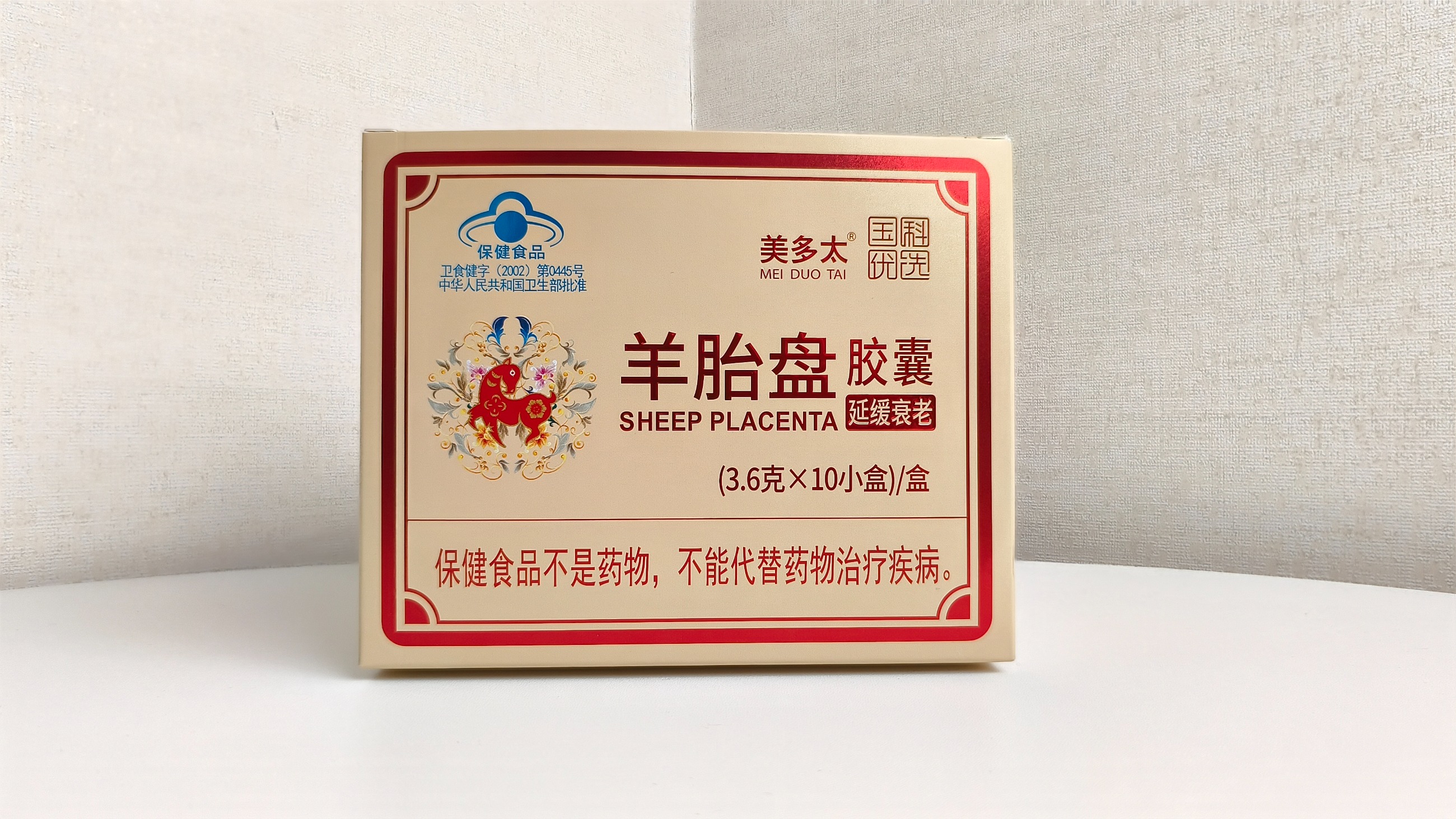 本品是以羊胎盤、淫羊藿、菊花、紅花為主要原料制成的保健食品,經(jīng)功能試驗(yàn)證明,具有延緩衰老的保健功能